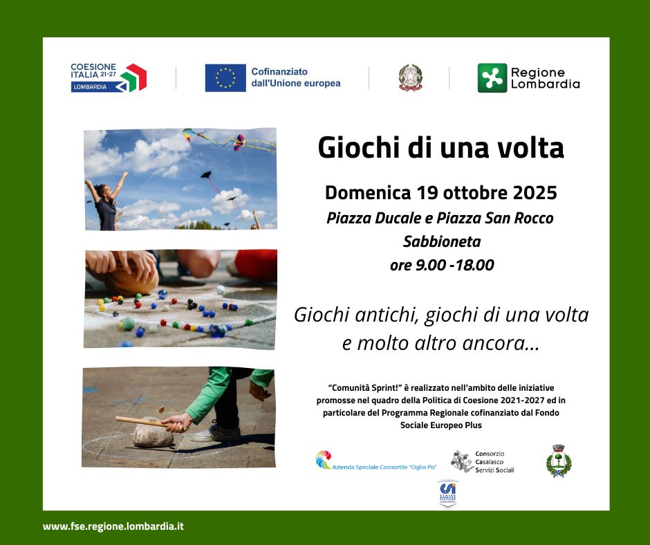 In occasione della Fiera di San Gallo il Comune di Sabbioneta ha inserito nella ricca programmazione due eventi gratuiti ed aperti a tutti, sabato 18 e domenica 19 ottobre nell'ambito del progetto "Comunità Sprint!" realizzato grazie al finanziamento del Fondo Sociale Europeo Plus e della Politica di Coesione 2021-2027