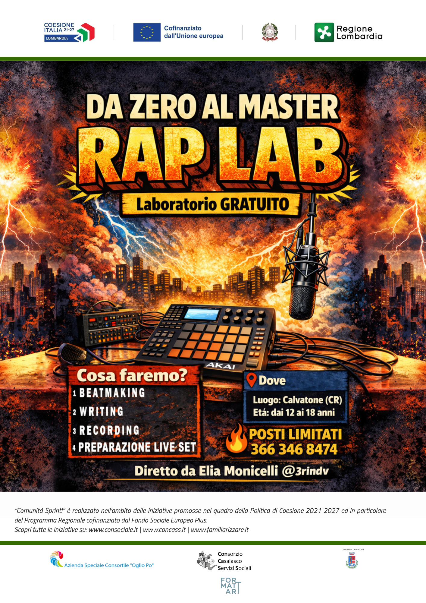 Prende avvio a Calvatone (CR) il laboratorio “DA ZERO AL MASTER – RAP LAB”, un percorso formativo gratuito rivolto a ragazze e ragazzi tra i 12 e i 18 anni, finalizzato alla promozione dell’espressione artistica e allo sviluppo di competenze linguistiche, relazionali e creative attraverso il linguaggio del rap.